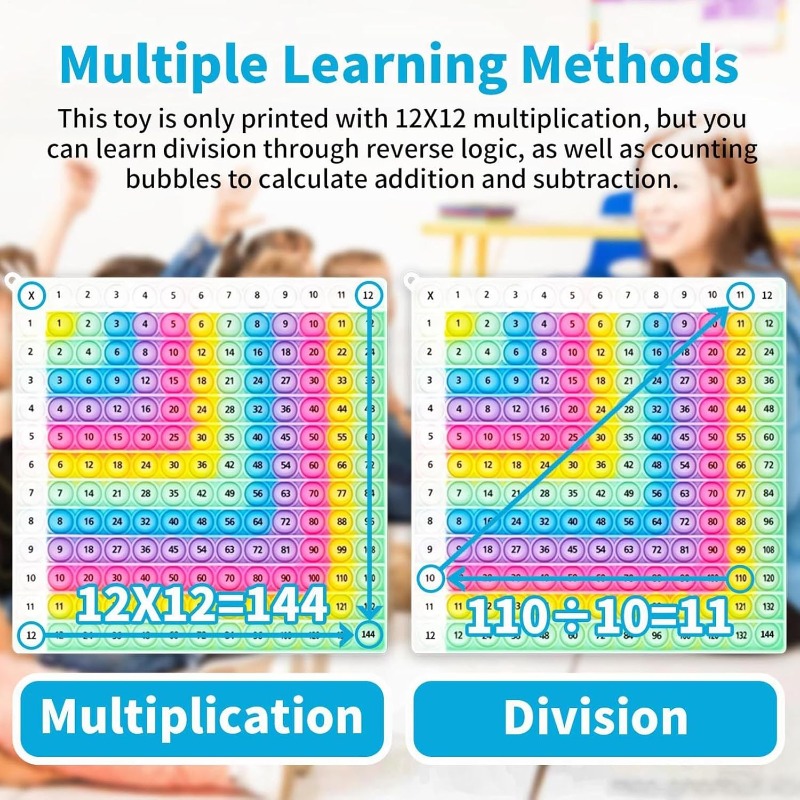 The printed 12×12 table teaches multiplication at a glance. Use reverse logic for division and count bubbles to practice addition and subtraction.